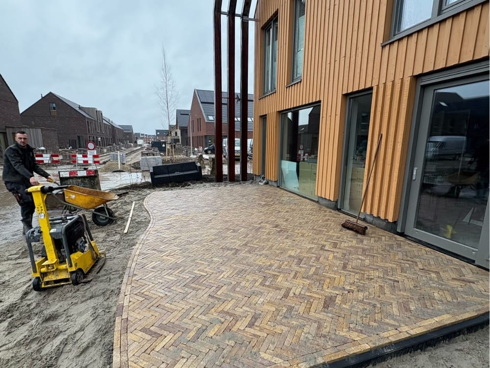 Op het gebied van bestrating is gekozen voor een combinatie van creatieve én functionele elementen. Zo is een opvallend cirkelvormig terras gerealiseerd als gezellige zithoek, gecombineerd met een ruim terras in een stijlvol visgraatmotief. De bestrating sluit naadloos aan op de woning en creëert logische en prettige looproutes door de tuin. Hoogwaardige stenen zijn gebruikt en netjes afgewerkt, wat zorgt voor een verzorgde en duurzame uitstraling.