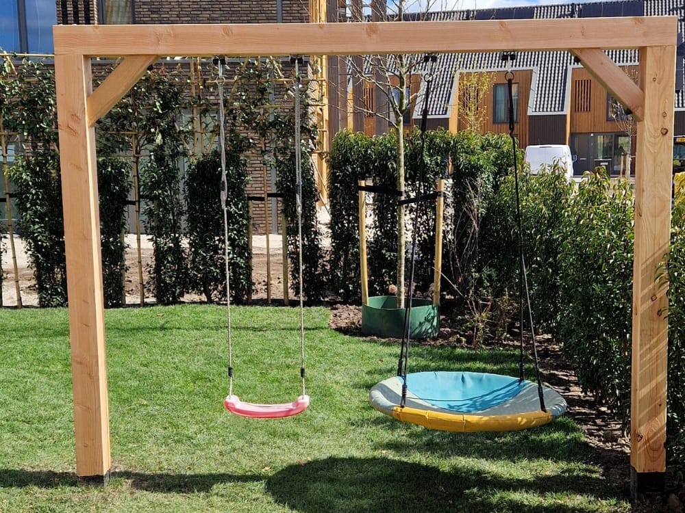 Voor gezinnen met kinderen is een stevig verankerd houten speeltoestel geplaatst, waarmee veilig buitenspelen mogelijk is. Daarnaast zorgen houten pergola-elementen voor extra karakter en de mogelijkheid tot verticale begroeiing, wat bijdraagt aan extra schaduw en beleving.