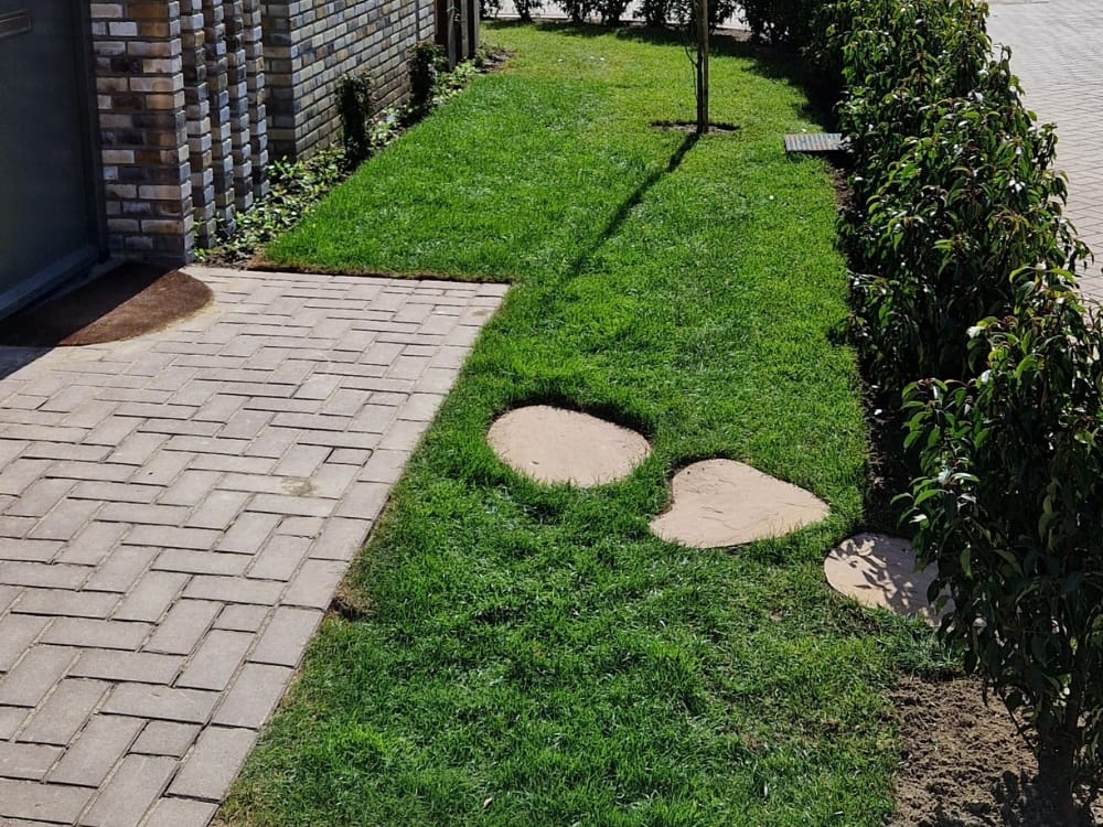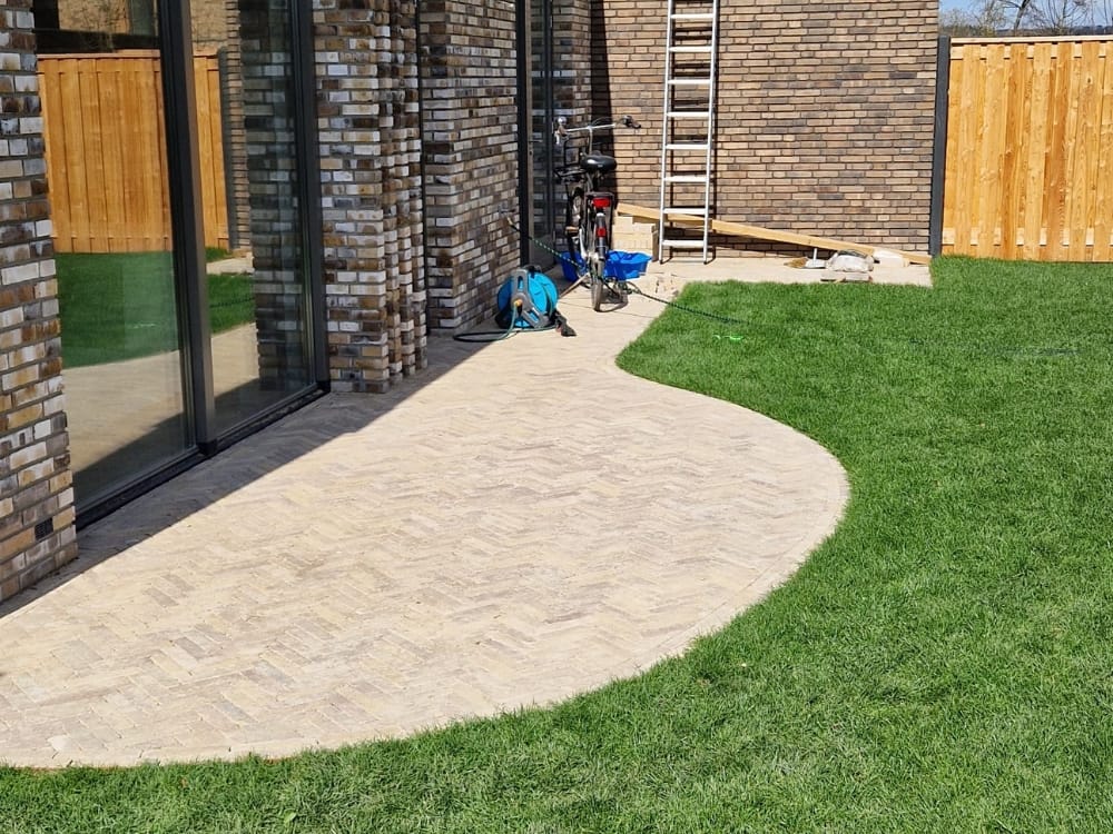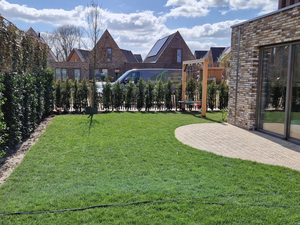 Het gazon is aangelegd met frisgroene graszoden die strak zijn afgestoken en perfect aansluiten op het straatwerk. Er is tevens rekening gehouden met praktische voorzieningen zoals aansluitpunten voor tuinverlichting en een beregeningssysteem, wat zorgt voor optimale groei en sfeer in de buitenruimte.