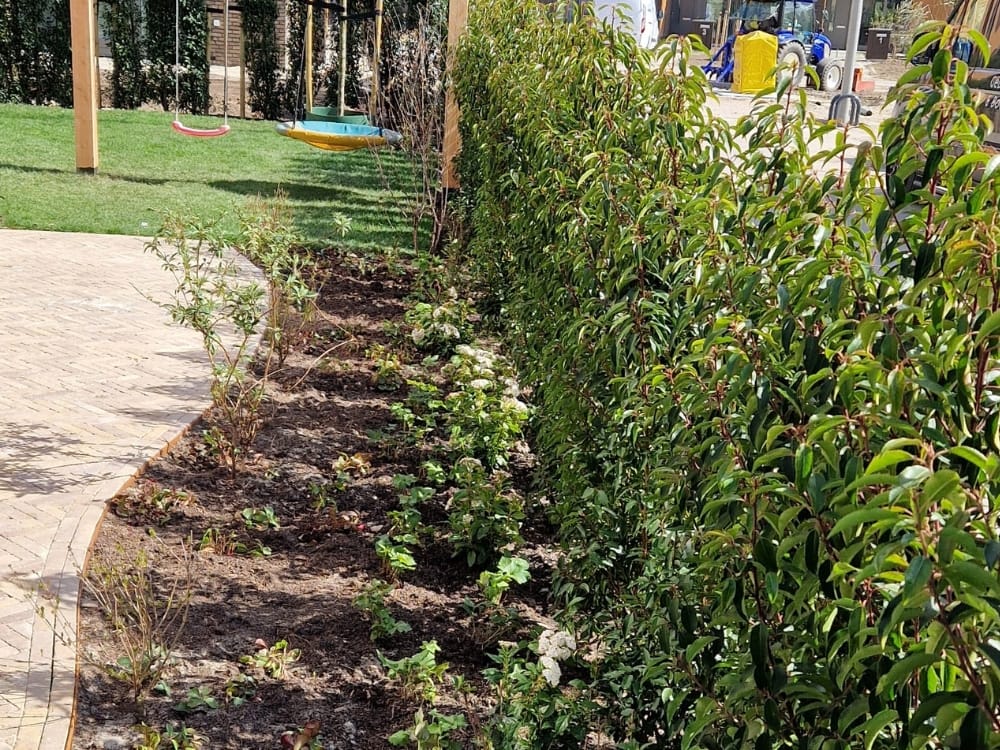 Om privacy en sfeer te waarborgen, zijn langs de erfgrenzen volwassen hagen geplaatst, zoals de wintergroene Portugese laurier. Daarnaast zorgen klimplanten tegen schermen voor een natuurlijke, groene afscheiding die het hele jaar door een fraai beeld geeft. De beplanting is strak in lijn aangebracht en de borders zijn opgebouwd met voedzame aarde, waardoor gezonde groei wordt gestimuleerd. In de borders zijn onder andere lavendelplanten geplaatst, die niet alleen kleur en geur toevoegen, maar ook bijen en vlinders aantrekken – een waardevolle bijdrage aan de biodiversiteit.